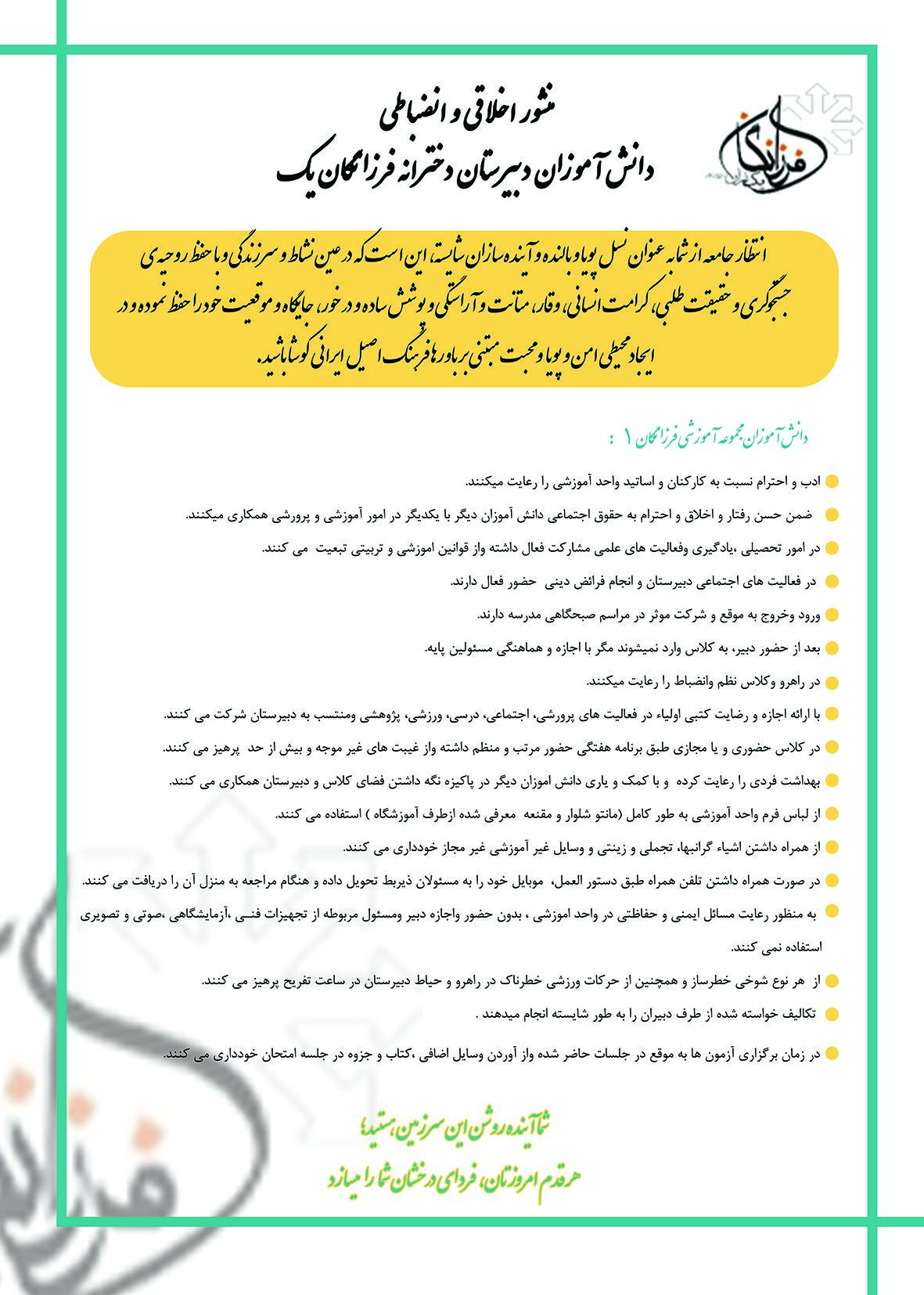منشور اخلاقی و انضباطی دانش آموزان فرزانگان یک
